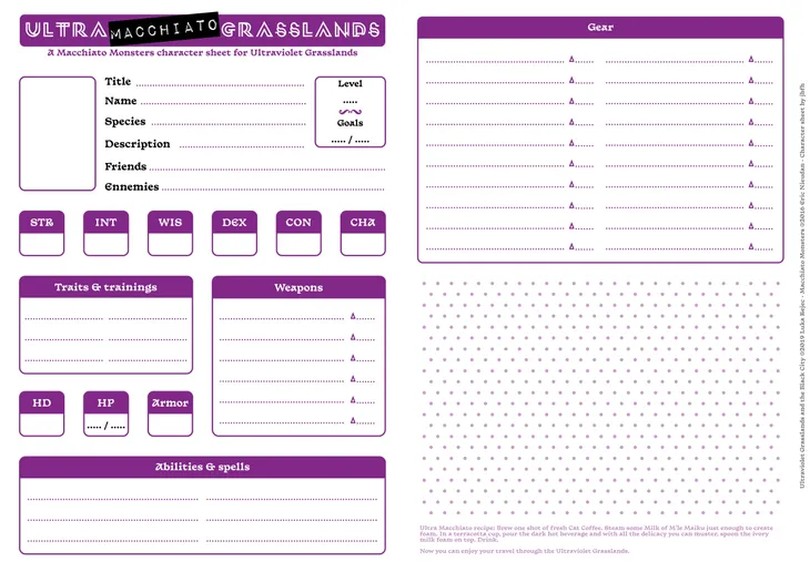 JBFH a créé une feuille de personnage adapté aux règles du jeu Macchiato Monsters créé par Eric Nieudan pour jouer au jeu Ultra Violet Grassland de Luka Rejec.