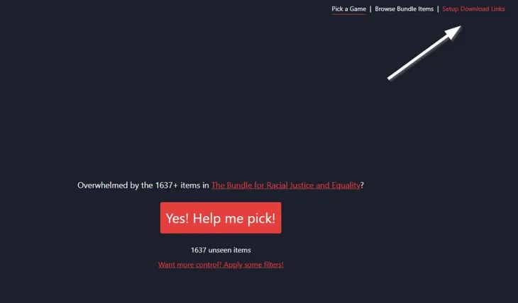 Le site Random Bundle Game vous permet également un accès direct aux liens de téléchargement via le menu Setup Download Links situé en haut à droite du site. Il vous suffit d'y coller le lien que vous obtenez via itchio pour le téléchargement de vos contenus, et le site vous proposera un téléchargement direct de vos sélections et recherches.
