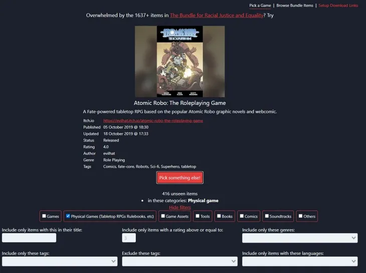 Le site Itch.io a rapidement atteint ses limites : habituellement les bundles proposés sur la plateforme atteignent rarement plus de 50 jeux. Heureusement est apparue la plateforme https://randombundlegame.com/ qui permet de s'y retrouver. Le site permet des recherches par type de contenus, y compris jeux de rôle. Une aide indispensable si vous souhaitez profiter un maximum de tous ces titres disponibles.