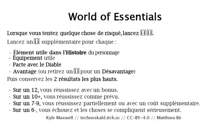 Notamment World of essentials (lien vers le jeu), une petite mécanique de jeu mixant FKR et PBTA. Tout tiens sur une carte de visite.
