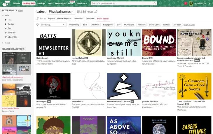 Mais il s'est passé un truc assez inattendu dans notre milieu de rôlistes sur internet. Un « petit truc » insignifiant qui a vraiment changé de manière durable une partie des univers du jeux de rôles en matière de publication et d'expérimentation. Je vais te parler de la plateforme itch et sa page consacrée aux JDR : https://itch.io/physical-games/newest